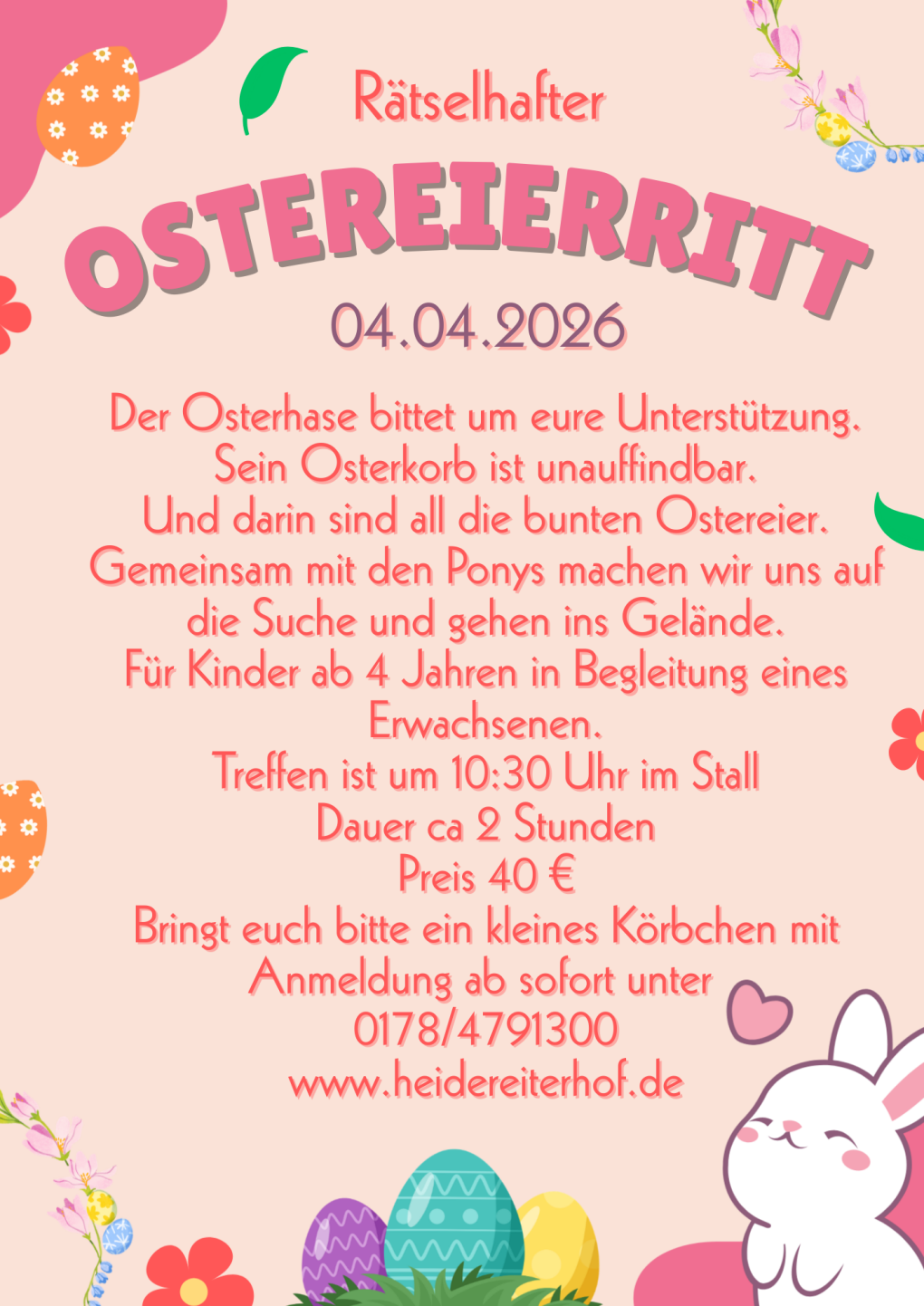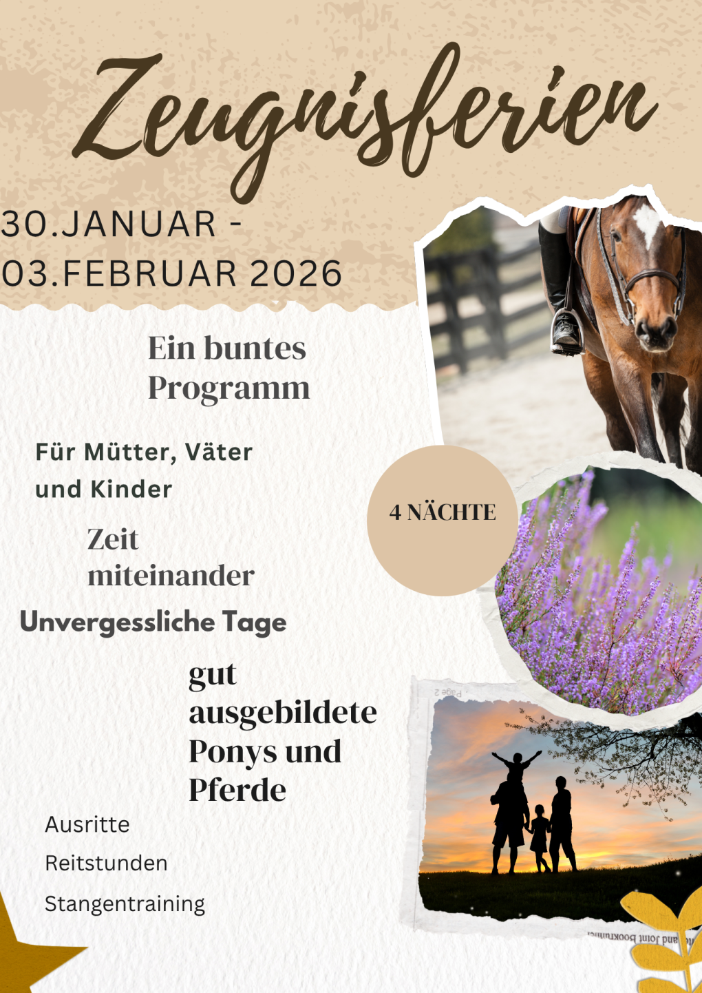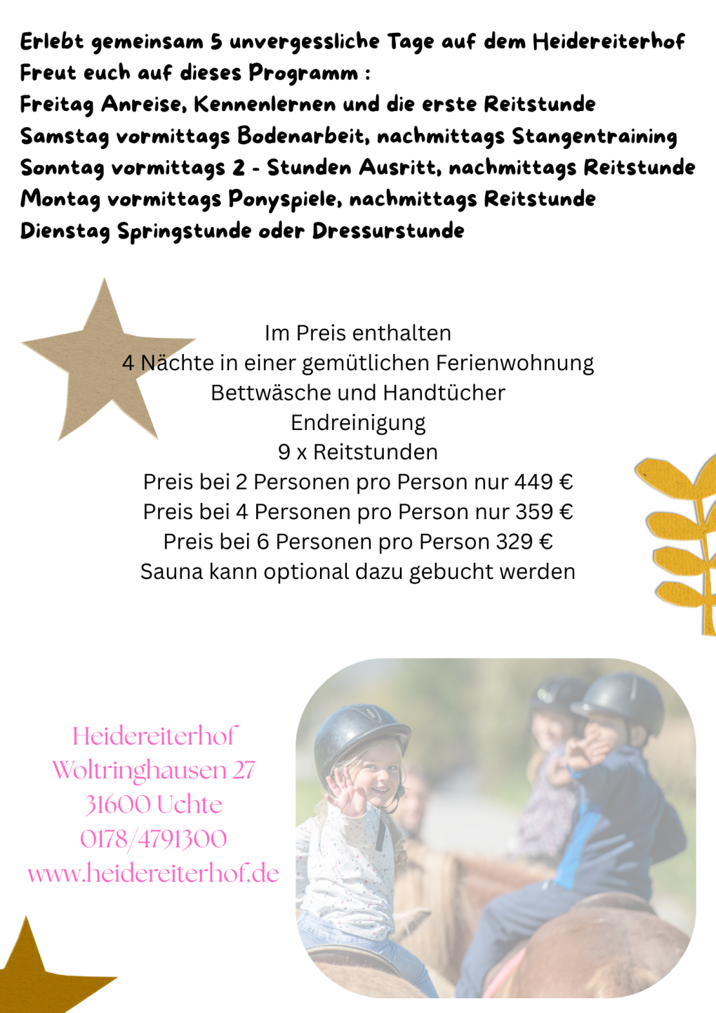 Darin enthalten ist ein ganz buntes und individuelles Angebot bestehend aus : 7 Übernachtungen im Dachzelt Bettwäsche und Handtücher Ein Begrüßungsgetränk Die Nutzung unserer Fasssauna an einem von euch gewählten Abend 6 individuelle Reitstunden, die aufeinander aufbauen - Dressur, Stangenstunde, Springstunde 1 Ausritt 2 Stunden 1 Ausritt in die Kirchdorfer Heide Dauer ca 3 Stunden 1 mal Ponyralley - ihr bekommt ein Pony von uns ausgeleihen und startet damit ins Gelände. Ihr findet lustige und spannende Aufgaben und Fragen rund um das Thema Pferde