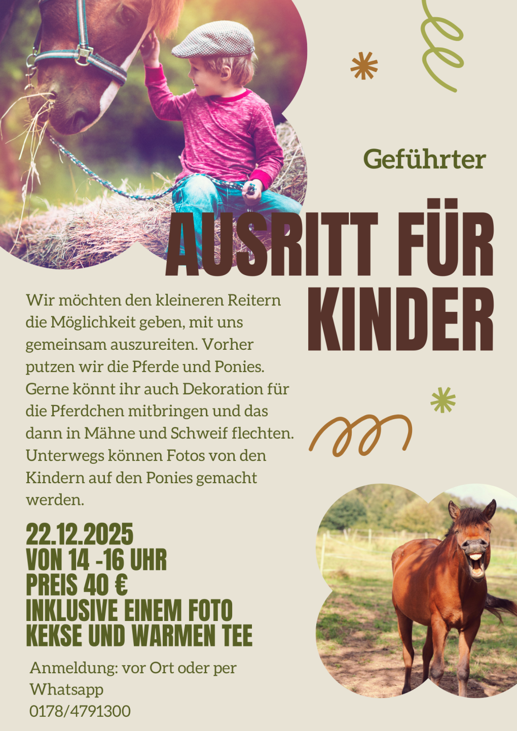 Unsere PonyKids sind maximal 4 Kinder pro Gruppe So können wir in einer entspannten Atmosphäre ohne Druck, sondern mit viel Spaß unserem Partner Pferd näher kommen. Praktisches und theoretisches Wissen rund um unseren Partner Pferd werden kindgerecht und mit dem Fokus auf Sicherheit für die Kinder und einem liebevollen Umgang gegenüber dem Pony vermittelt. So werden unsere kleineren Kinder und die Ponys zu einem echten Team Was ist in unserem Programm enthalten : Ponypflege – wie putze ich ein Pferd richtig ? Ausrüstung kennen lernen – was ist was ? Bodenarbeit – wie führe ich ein Pony ? Erstes Reiten und Reitübungen – wie fühlt sich ein Pony in der Bewegung an ?